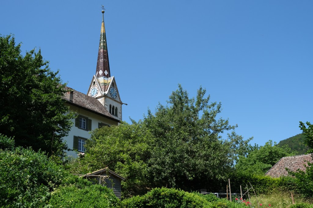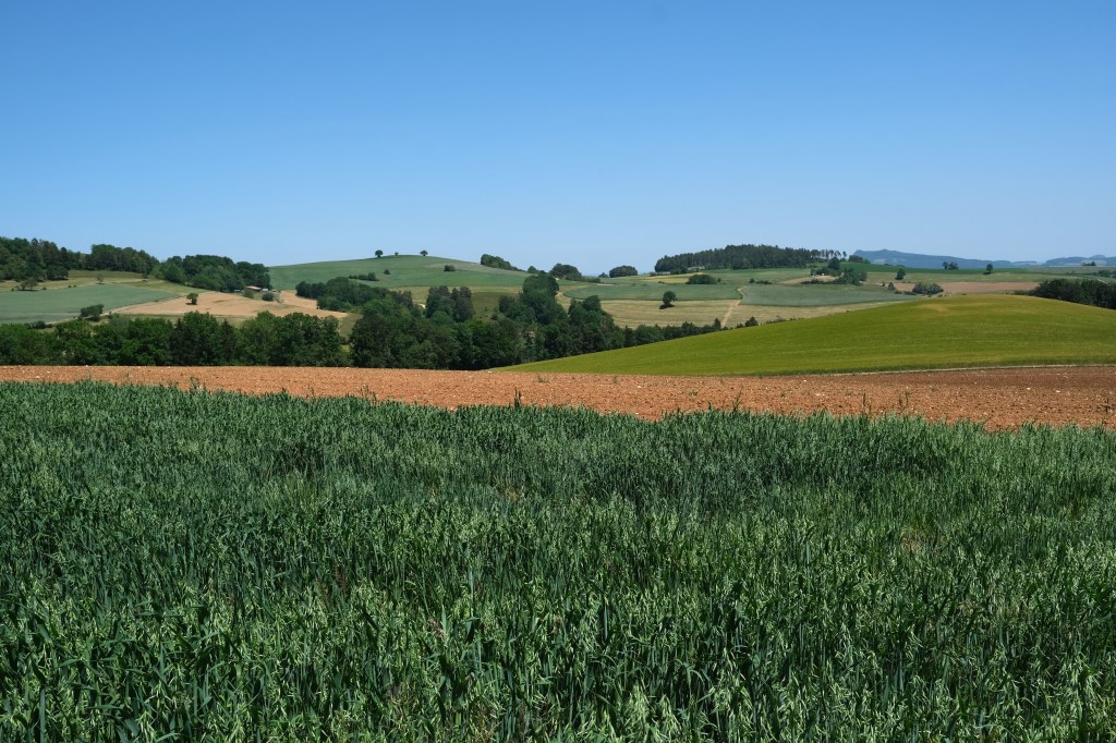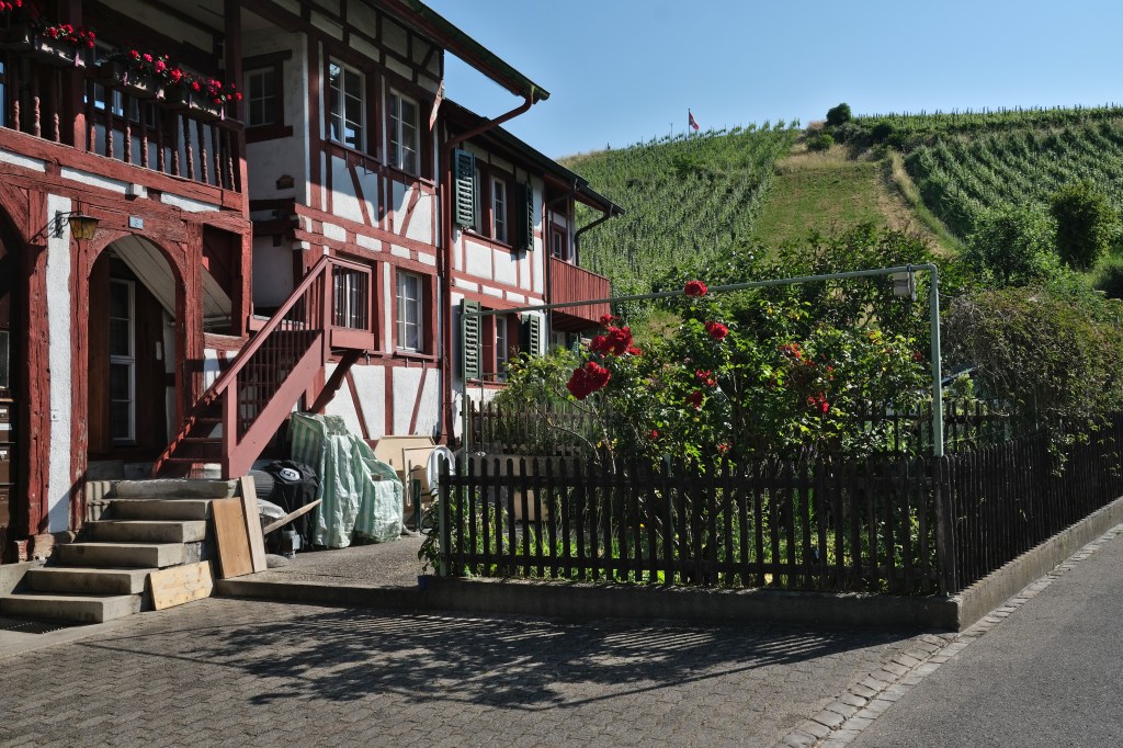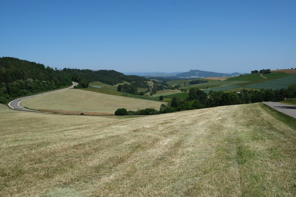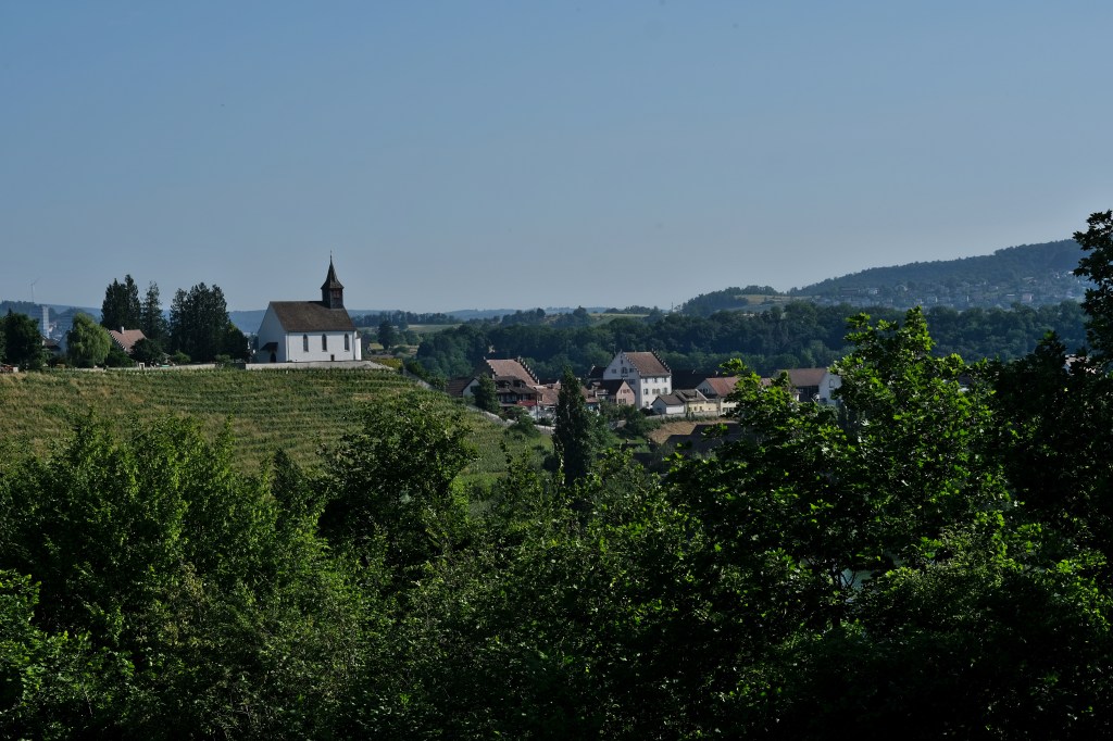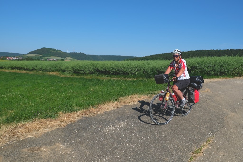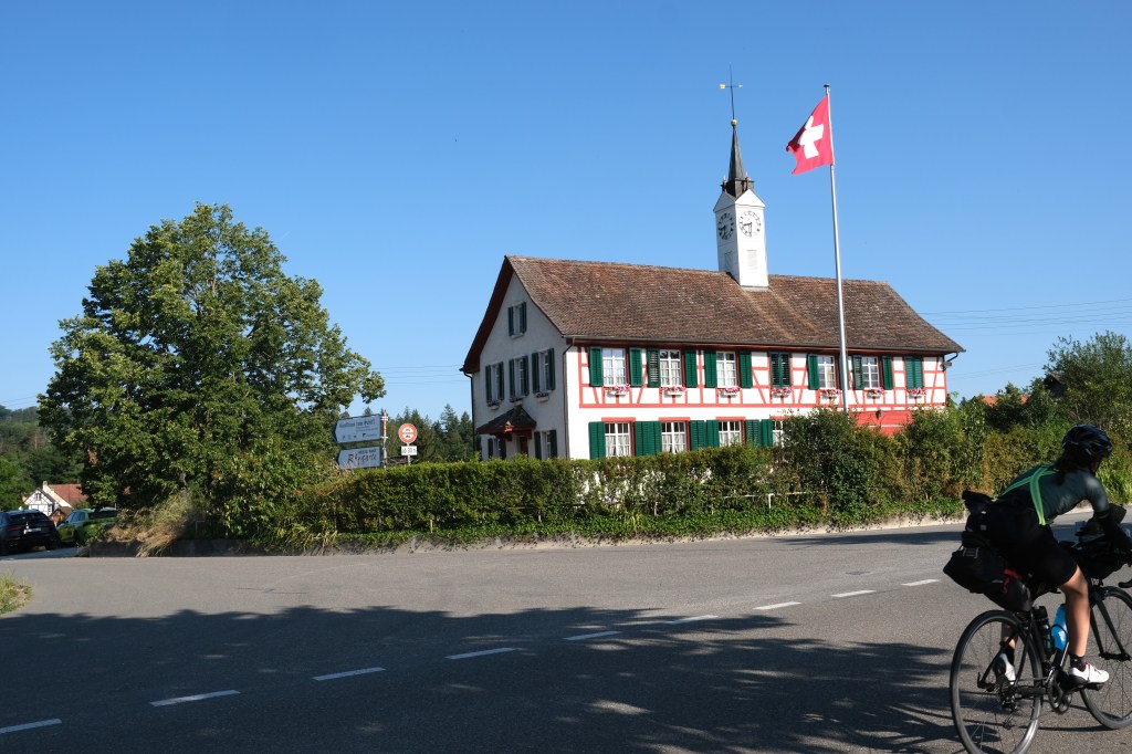 Commence alors une premiĂšre vraie montĂ©e entre 2% et 5% Ă travers un paysage de sortie de ville avec des carrossiers, des supermarchĂ©s, des usines dont une trĂšs belle visiblement luxueuse IWC SCHAUFFHAUSEN, aprĂšs recherche on comprend que la beautĂ© des batiments va avec le prix des montres fabriquĂ©es. Nous avons hĂ©sitĂ© mais le temps presse et nous avons renoncĂ© Ă lâachat !! La cĂŽte continue ainsi pendant une dizaine de km. Le revĂȘtement est bon mais la route est passante. Heureusement lâespace rĂ©servĂ© aux cyclistes est large. Au bout de quelques temps le chemin tourne sur une route plus petite qui traverse des villages. 35 km. Nous nous arrĂȘtons Ă lâombre pour manger juste avant la grosse montĂ©e. Le coach tient Ă tout prix Ă ce que je prenne des forces. Je suis obligĂ©e dâallonger mes cuisses pour les dĂ©tendre (il faut quâelle tiennent) . AprĂšs un repas de tomates et de fromage la course reprend. Le marquage de la route a changĂ© il nây a plus la bande cyclable et les piquets sur le bord de la route sont noir jaune rouge, nous avons changĂ© de pays, sans nous en apercevoir et nous roulons en Allemagne. Deux kilomĂštres aprĂšs nous retrouvons notre bande cyclable, bienvenue en Suisse. Une barriĂšre rouillĂ©e, un panneau, des bornes dans les champs matĂ©rialise la sĂ©paration. Les frontiĂšres nous Ă©tonneront toujours. La route tourne dans ce dĂ©cor champĂȘtre et soudain surgit un mur face Ă moi. (Bon jâexagĂšre un peu mais je comprends quand mĂȘme que la grande cĂŽte est lĂ me dĂ©fiant). Je pĂ©dale trĂšs doucement en 1-1(cf 1Ăšre leçon de cococyclopĂšde) les cuisses brulent, Ă cĂŽtĂ© les cyclistes en vĂ©lo Ă©lectrique mâencouragent en me doublant (du moins je lâimagine car je ne comprends rien). Soudain dans un virage ça bloque, malgrĂ© lâeffort, le vĂ©lo ne bouge plus je suis obligĂ©e de descendre et de pousser le vĂ©lo. Mais, progressivement, le vĂ©lo ne veut plus avancer, mĂȘme les pauses ne suffisent plus. Heureusement, le sauveur arrive en courant. Il a posĂ© son vĂ©lo en haut de la cĂŽte. Il a compris la difficultĂ©. Ă 17% impossible pour moi de pousser le vĂ©lo. Il reste 100m et, assis sur un banc, un couple de suisse francophone attend en regardant Hercule dans son treiziĂšme travaux ! La cĂŽte reprend mais plus douce et continue ainsi pendant 4 km.