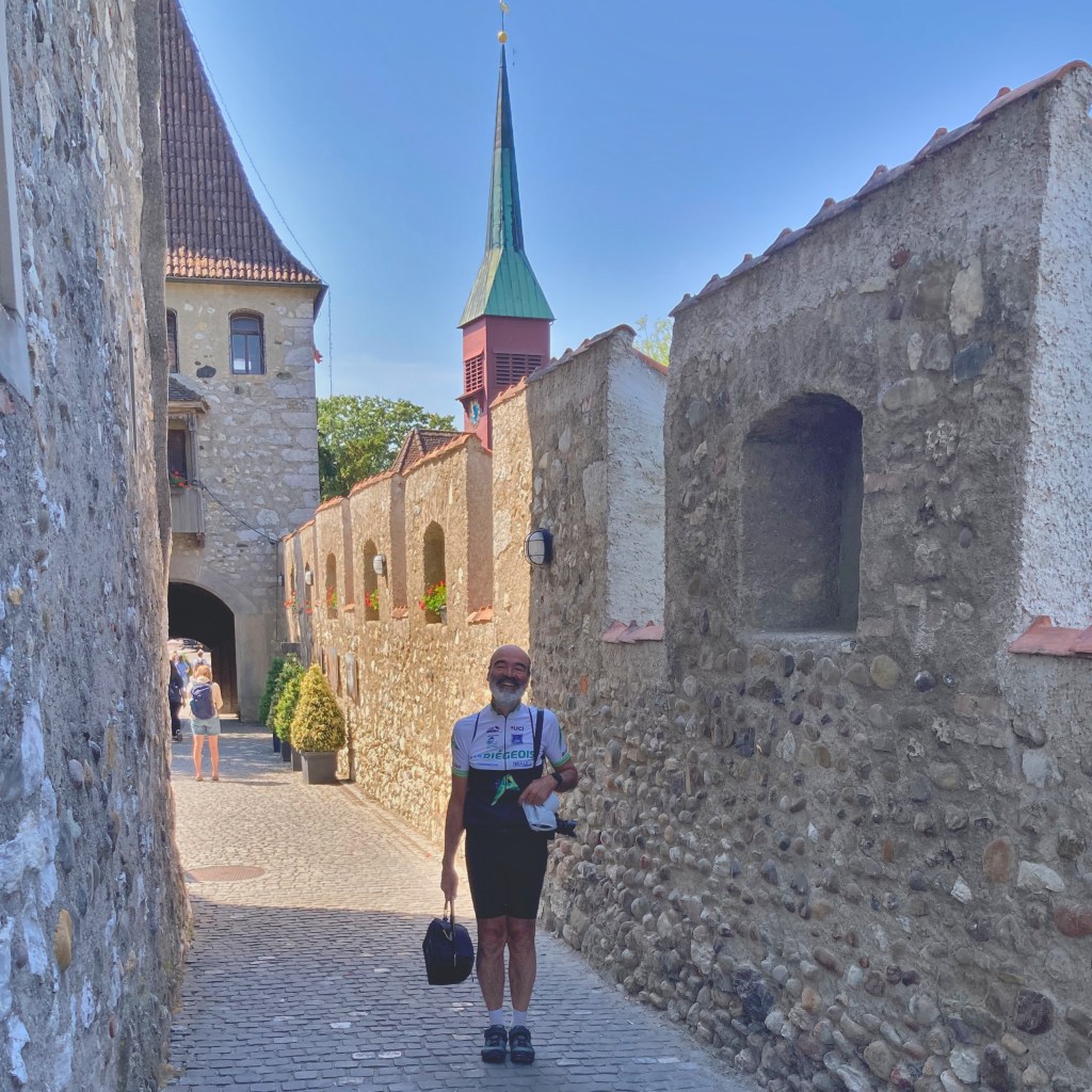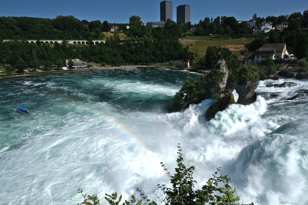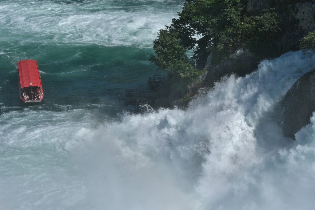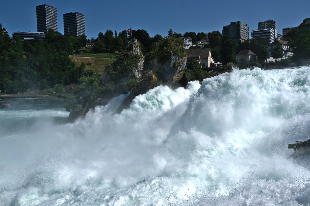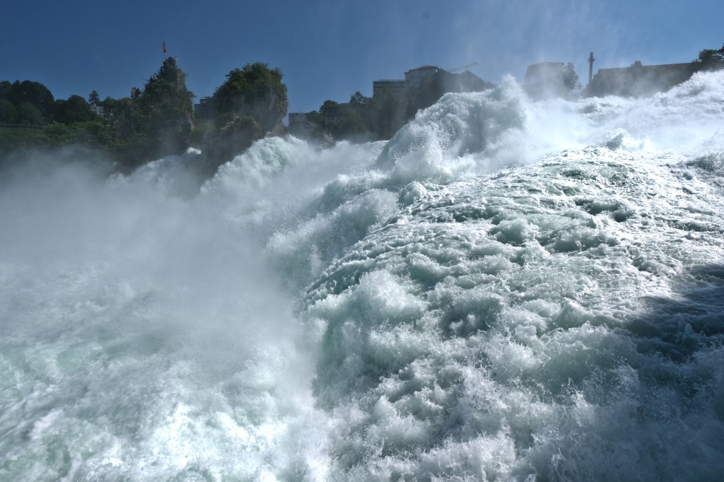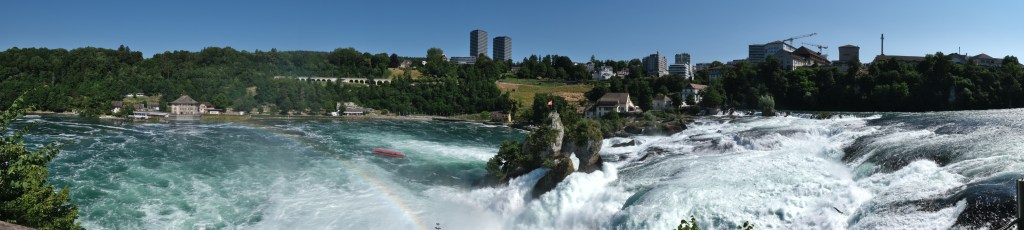 AprĂšs 20 km arrivent les fameuses chutes du Rhin qui dĂ©montrent la puissance et le dĂ©bit du fleuve. Ce nâest pas Iguazu mais elles impressionnent par leur dĂ©bit et le bruit. Les suisses ont mis en place des escaliers et passerelles permettant de sâapprocher au plus prĂšs. Les allemands ont construit deux tours juste en face pour pourrir le paysage. Quelques photos et selfie et il faut repartir. Puisse la force du fleuve nourrir les cuisses.