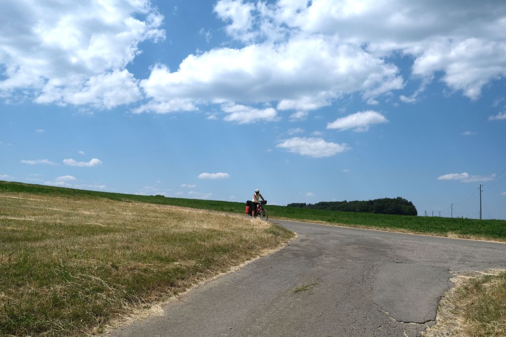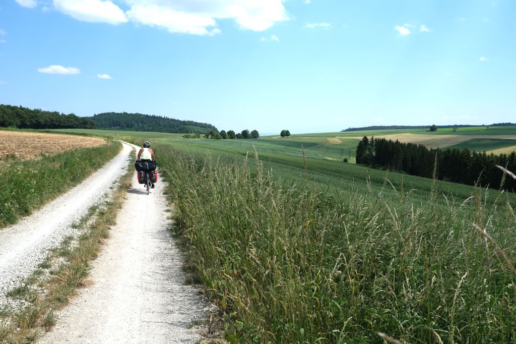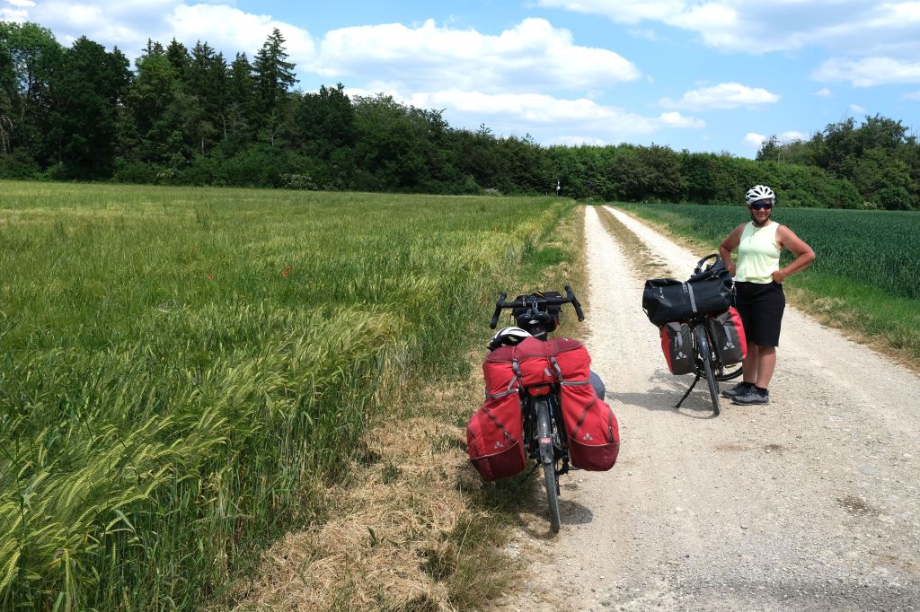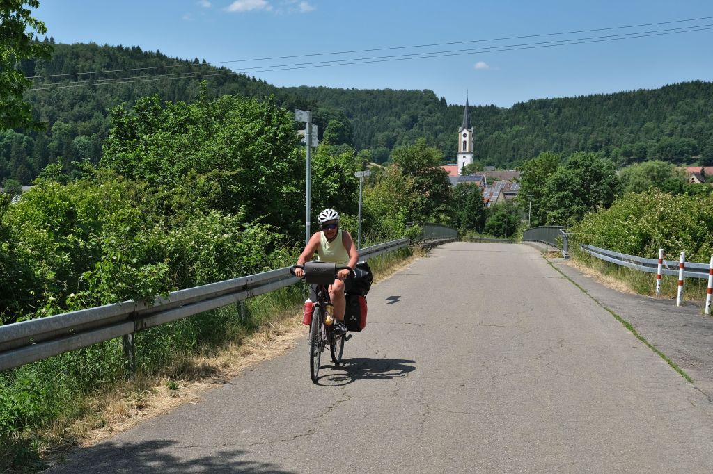 Nous ne sommes plus, depuis hier, sur lâEurovĂ©lo 6, et câest en suivant ce doigt que recommence le grincement de nos machines. La route sera plus facile, mĂȘme sâil faut repasser du cotĂ© du Rhin pour rejoindre le lac de Constance. La montĂ©e sera rude mais plus courte que la veille. La longue descente nous dĂ©posera au bord du lac.