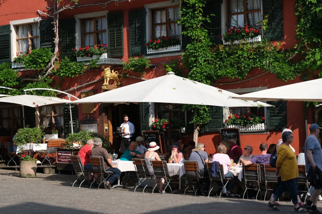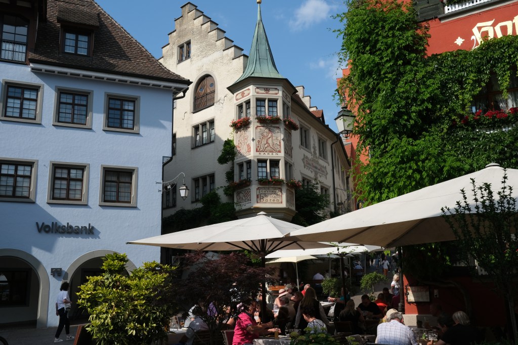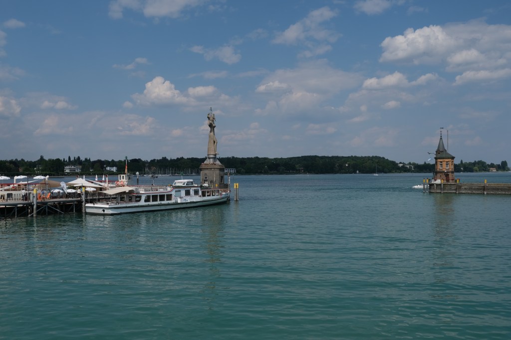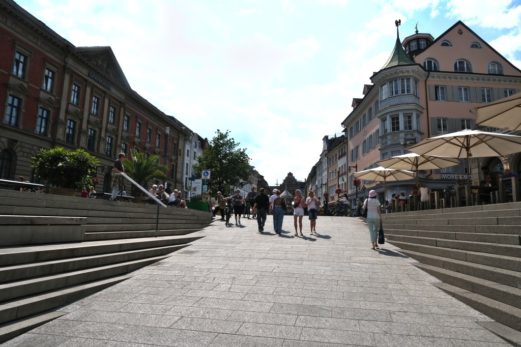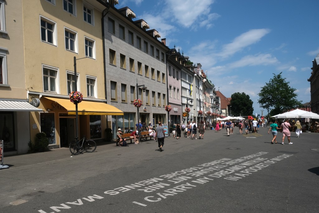 Comme nous nâavons pas prĂ©vu de faire le tour du lac et de parcourir les 260 kilomĂštres de pistes cyclables qui lâentoure, nous flĂąnerons dans le centre historique de Constance. Les larges terrasses de cafĂ©s accueillantes, les grandes places oĂč trĂŽnent des fontaines, les maisons aux façades peintes la prĂ©sence du lac tout proche et le beau ciel bleu donnent Ă cette ville un charme mĂ©diterranĂ©en.