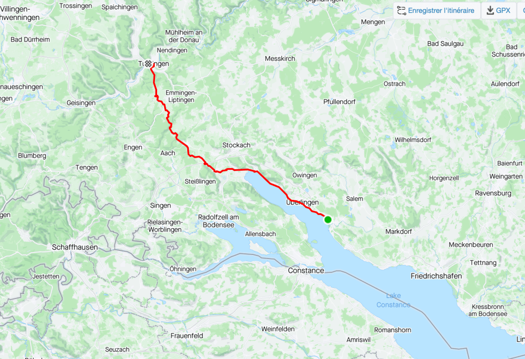AprĂšs avoir traversĂ© et reliĂ© deux lacs pour former le lac de Constance le Rhin est empĂȘchĂ© de poursuivre sa course vers l’Ouest et bifurque au Sud. Pour le Danube sa descente depuis sa source vers l’Est est Ă©galement bloquĂ© par une barriĂšre qui culmine au environs de 900 mĂštres d’altitude. C’est de part et d’autres de ces sommets que ces deux grands fleuves se croisent. Pour nous, aujourd’hui ce sera la troisiĂšme fois que nous passerons cet obstacle. La premiĂšre fois, en quittant le Rhin pour monter Ă  Donaueschingen, la deuxiĂšme pour rejoindre le lac de Constance et finalement la troisiĂšme en suivant Ă  nouveau l’EurovĂ©lo 6 pour rejoindre le Danube Ă  Tuttlingen. MĂȘme si cette Ă©tape semble plus facile que les prĂ©cĂ©dentes, il faudra tout de mĂȘme parcourir 55 km et 688 mĂštres de dĂ©nivelĂ© dont quelques cotes Ă  fort pourcentage.