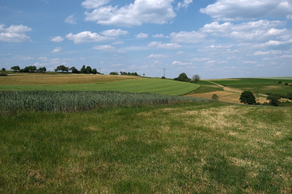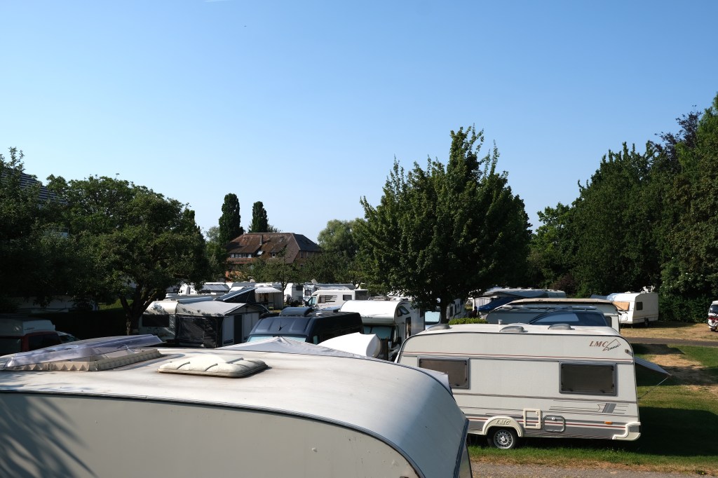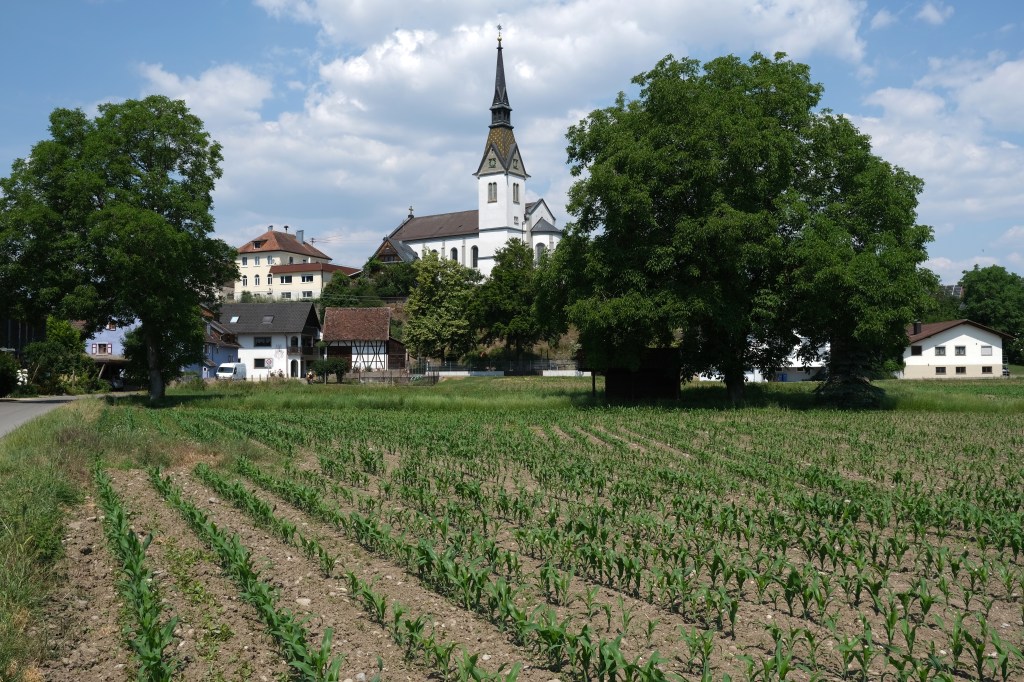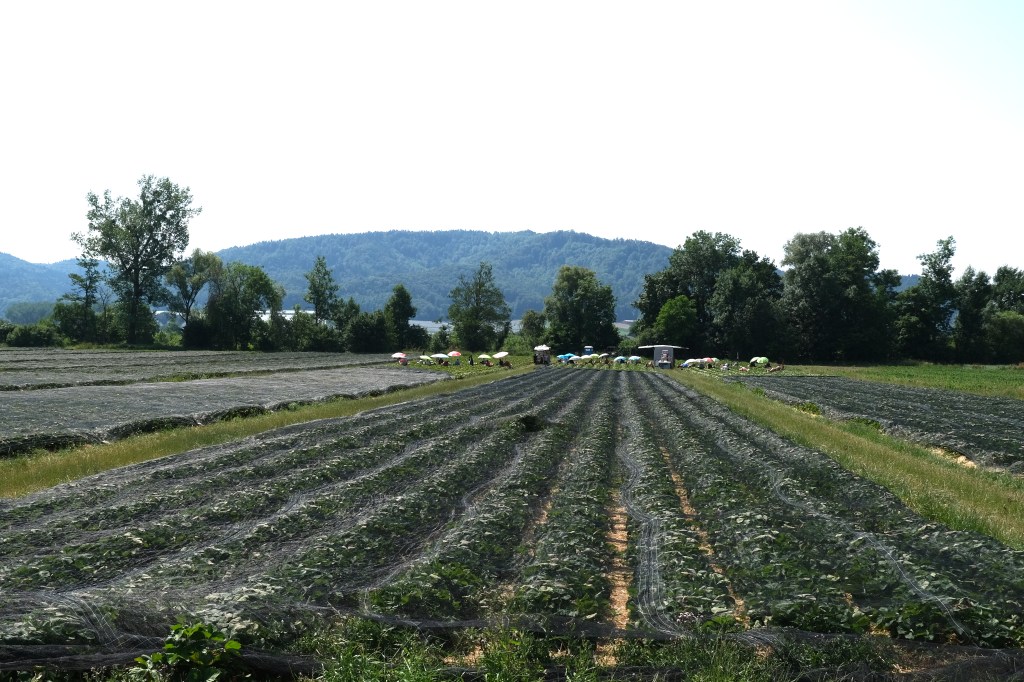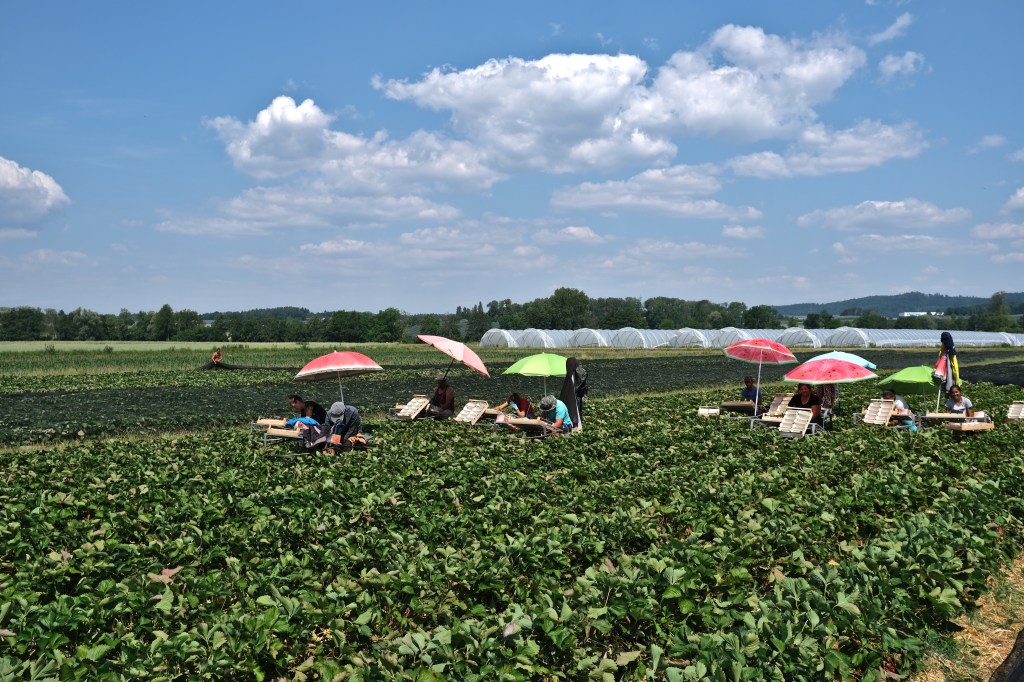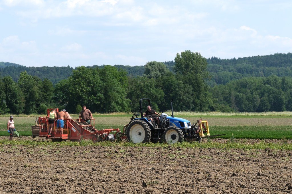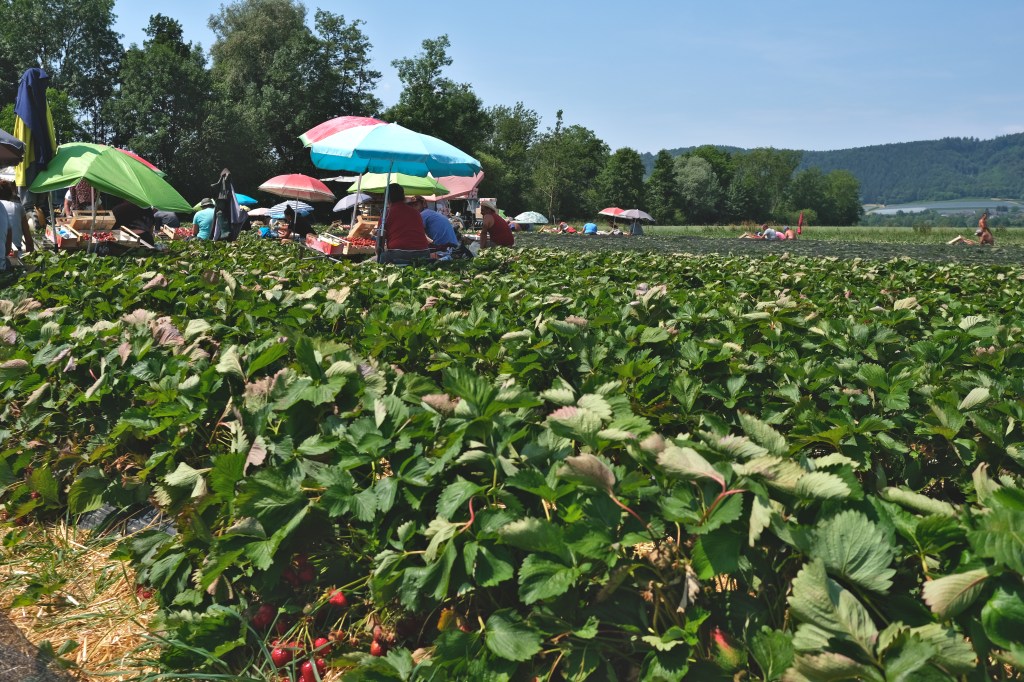 Cette Ă©tape commence en suivant le lac, ses campings surchargĂ©s de camping-cars en ce samedi de week-end, ses champs couverts de cultures maraichĂšres. Soudain un champ de fraisiers exhale un parfum Ă  faire arrĂȘter un cycliste. Au loin une lignĂ©e de parasols. Les ramasseurs de fraises, Ă  l’ombre ainsi que leur cueillette, avancent avec leur porte-cageots, le parasol et le siĂšge associĂ©s. Ne parlant ni turc ni allemand, je n’ai pu communiquer avec eux. Plus loin des ramasseurs de « kartoffeln », une sorte de tapis roulant s’enfonce dans le sol sur une vingtaine de centimĂštres et remonte la terre et les pommes de terre. Les trieurs autour du tapis sĂ©lectionnent les tubercules. Un tracteur s’arrĂȘte, un conteneur de patates derriĂšre lui. Le conducteur discute un peu, toujours en allemand, et nous propose de garnir nos sacoches de sa production. C’est gentil mais il nous reste encore quelques cotes Ă  monter.