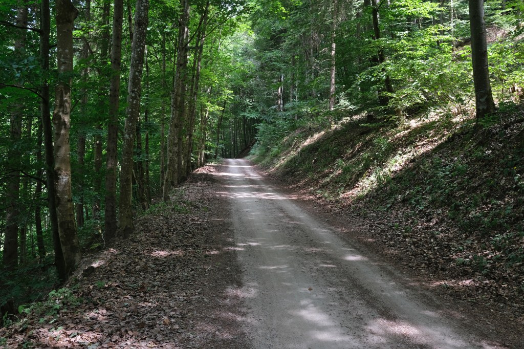 A l’Est de la ForĂȘt Noire que nous allons quitter, la piste ou route forestiĂšre se poursuit Ă  l’ombre.