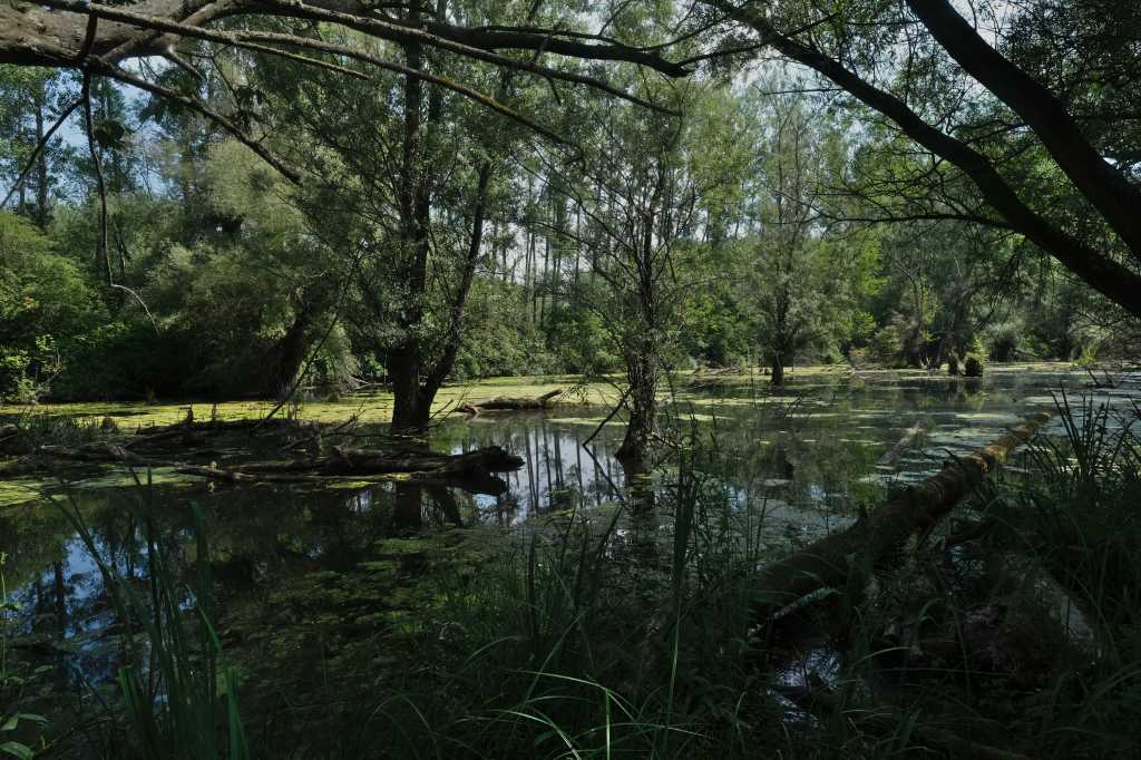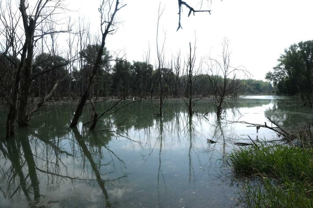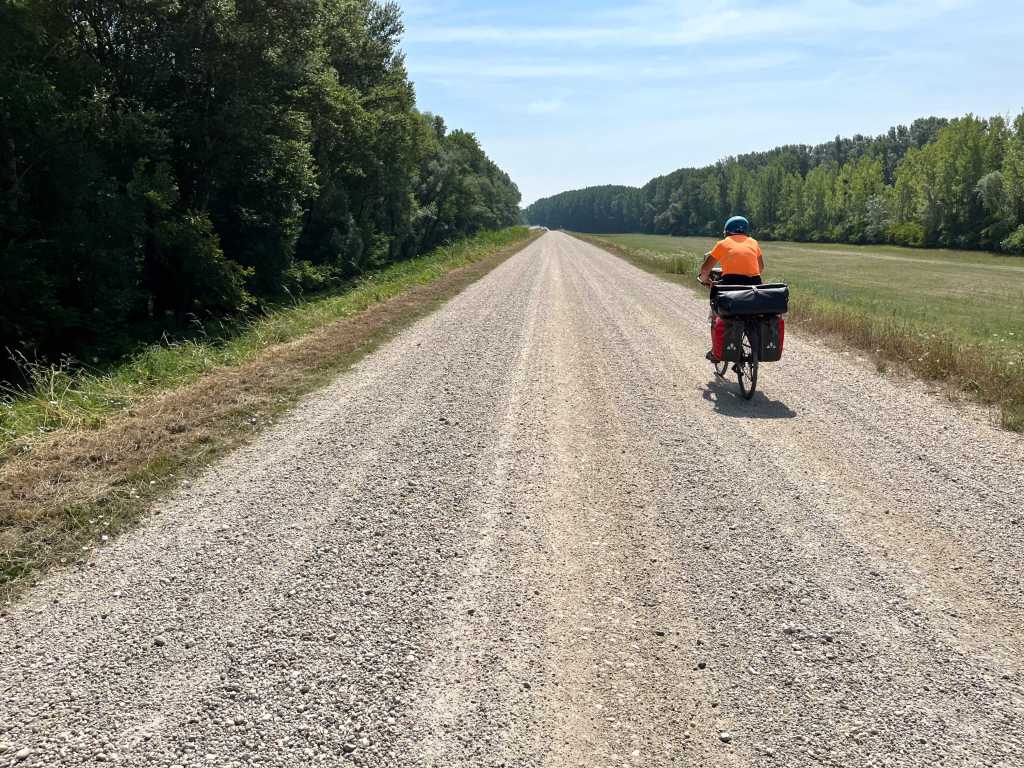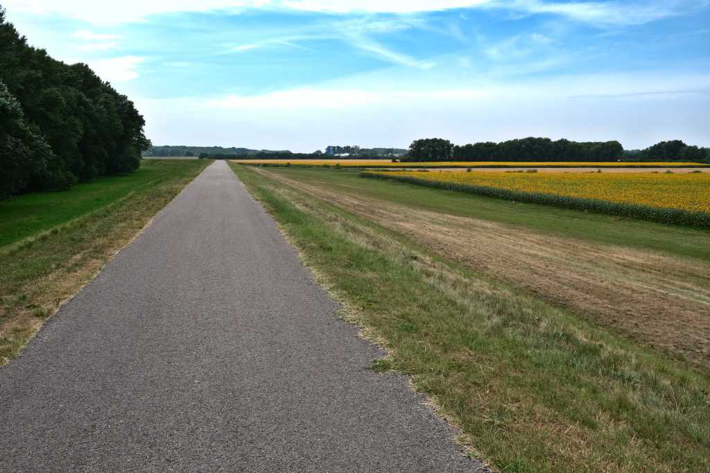 Sur une cinquantaine de kilomĂštres la piste suit un rideau d’arbres derriĂšre lequel s’étale le fleuve et sur la gauche des champs de tournesols et de cĂ©rĂ©ales.