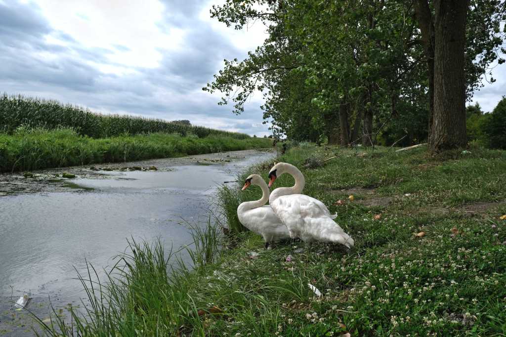Pourtant la campagne est belle. Nous traversons une zone marĂ©cageuse, ce matin la lumiĂšre sature les couleurs. Des centaines d’oiseaux tourbillonnant au loin. Seuls quelques cygnes que rien n’apeure, se laissent approcher.