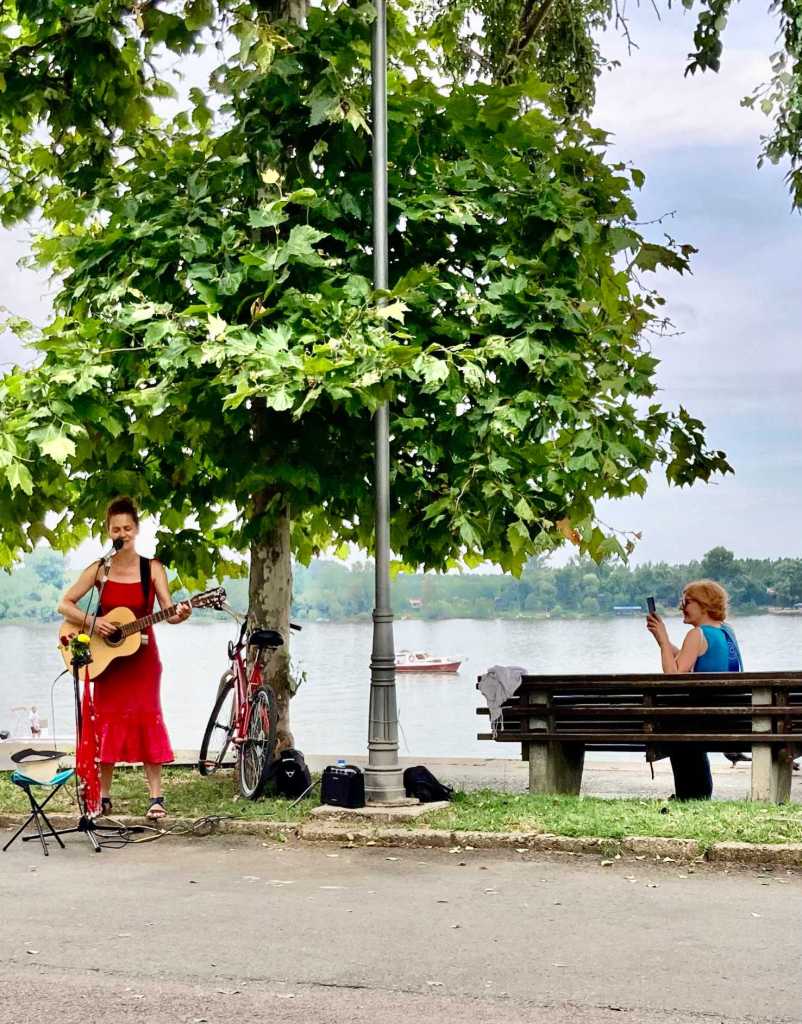 ArrivĂ©e agrĂ©able donc, par les bords de la Save. Sous des arbres une promenade, les gens se baladent, une glace Ă la mains, des barges sont rĂ©habilitĂ©es en restaurant, des vendeurs ambulants, une chanteuse Ă la voix cristalline Ă©grĂšne quelques standards de jazz, des gamins donnent Ă manger Ă une multitude de cygnes et cĂŽtĂ© ville des barres dâimmeubles entourĂ©es de parcs.