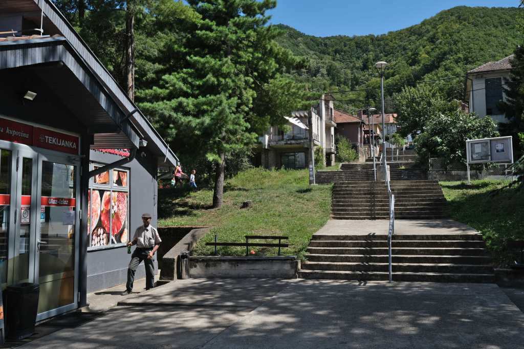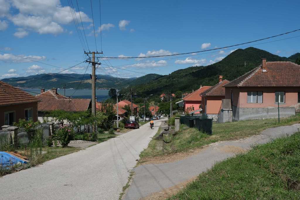 ArrĂȘt dans un village d’oĂč thĂ©oriquement partent les bateaux pour visiter la Table de Trajan. Nous n’avons trouvĂ© que l’Ă©picerie et une table sur la place du village.
