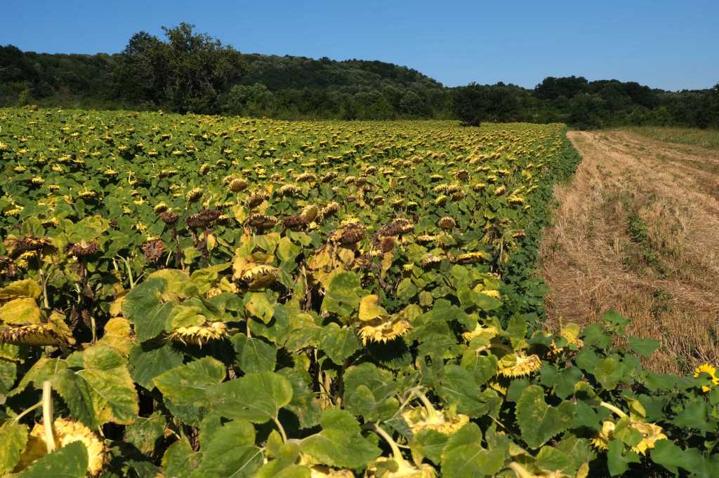 Les grands champs de céréales moissonnées, de tournesols et de maïs se succÚdent.