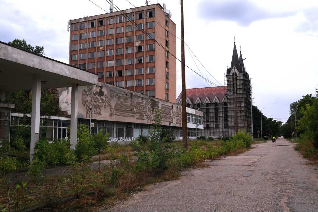 DĂ©part de Vidin en longeant le Danube. Les mĂȘmes immeubles « annĂ©es 50 » dĂ©crĂ©pis et encore plus gris sous la pluie. La « piste cyclable » dĂ©foncĂ©e nous fait traverser une zone d’usines dĂ©saffectĂ©es et en ruine avant de nous jeter sur la route nationale.
