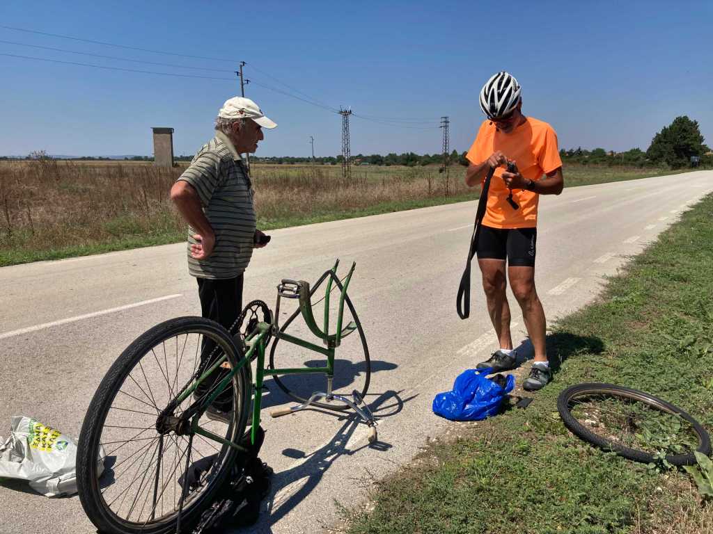 Miro est dĂ©pitĂ©. La roue avant de son biclou hors d’Ăąge est crevĂ©e, il n’a rien pour rĂ©parer et le village est encore loin. Je m’arrĂȘte.