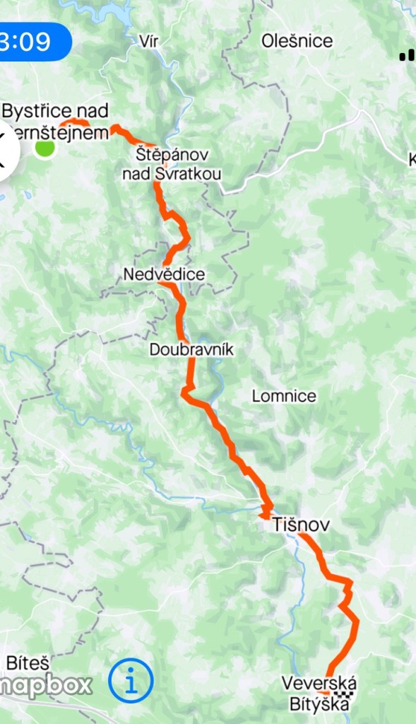 L’itinéraire modifié ressemble à l’initial sans le passage au bord du lac de Vir. Une longue descente et des bosses jusqu’à Veverska Bityska. La difficulté de la fin de l’étape ne nous permet pas d’atteindre Brno, deuxième plus grande ville de Tchéquie et capitale de la région de Moravie.