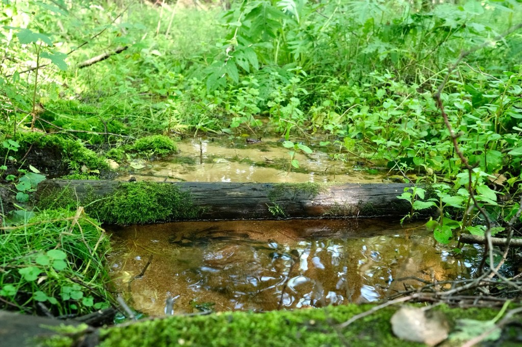 Retourner en arriĂšre semble peu envisageable alors nous poursuivons jusqu’au moment oĂč notre trace boueuse et creusĂ©e se perd dans un champ. AprĂšs en avoir fait le tour, sans trouver d’issue, dans la forĂȘt, une piste se dessine et s’ouvre au milieu des arbres.