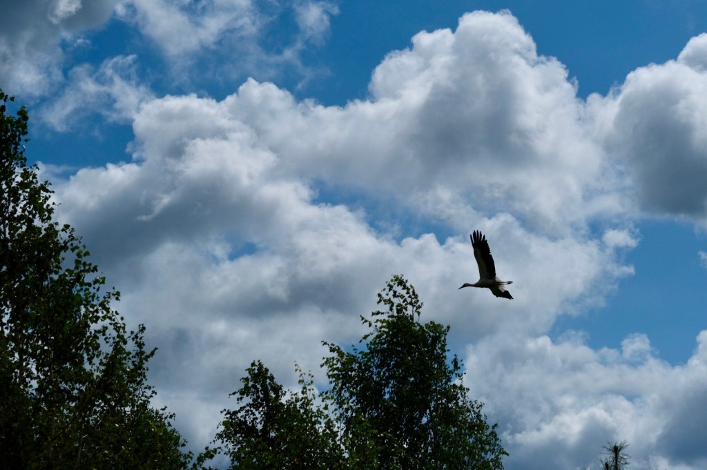 L’Ă©tape du jour commence comme celle de la veille. Petite route lĂ©gĂšrement vallonnĂ©e. Les cigognes toujours trĂšs prĂ©sentes nous observent.