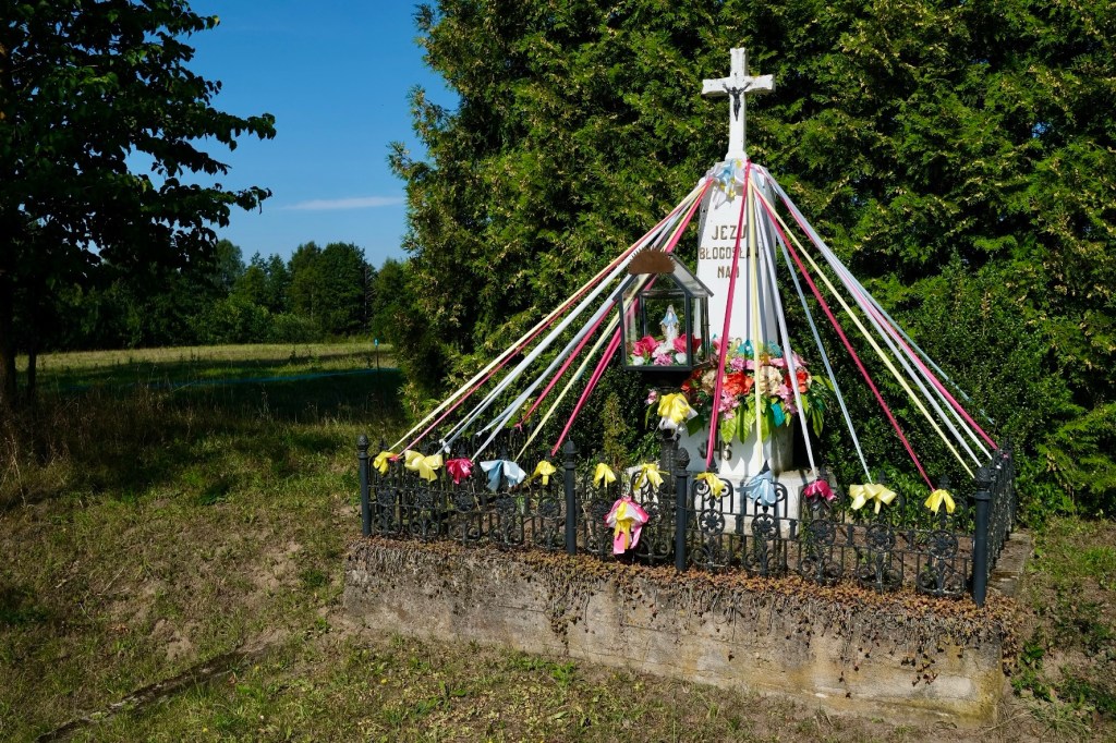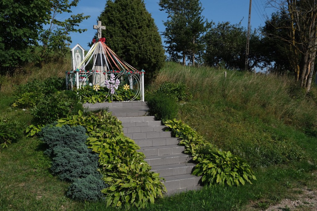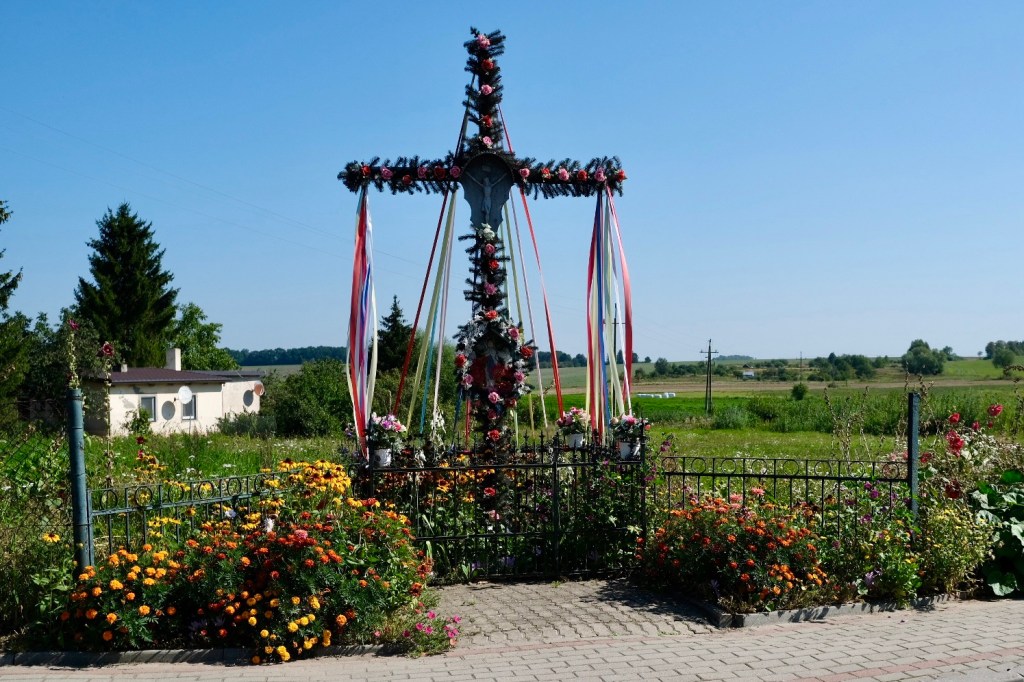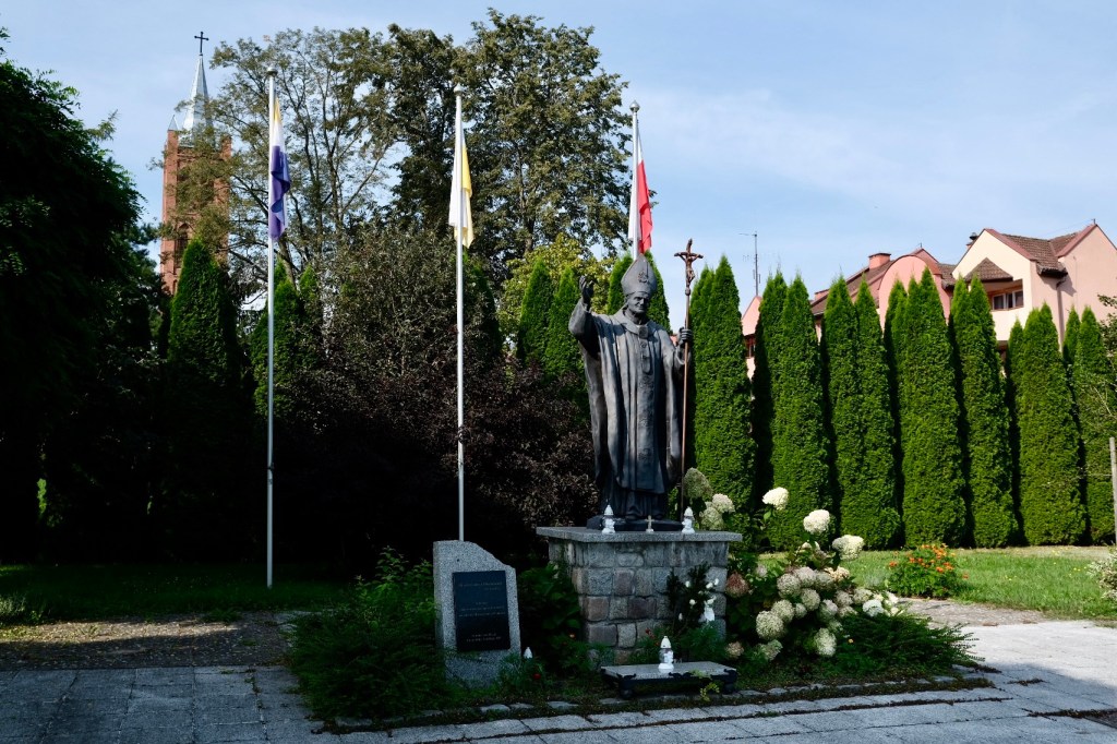 Pas de doute possible, nous pédalons bien en Pologne. Des crucifix et des ex-voto décorés, des statues de Jean Paul II décorent de nombreuses places et villages, d’innombrables églises, toutes possédant leur tableau, photo, vitrail ou statue de l’icône polonaise, Jean Paul II.