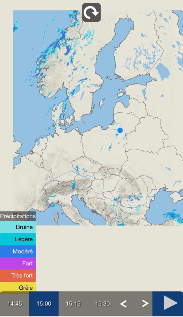 Il commence à pleuvoir en approchant de la ville de Goldap. La carte météo indique que l’ondée sera brève et très localisée. En effet le seul nuage présent en Pologne se trouve au dessus de nos têtes. Serait ce le même qui nous suit et nous arrose régulièrement depuis Nancy ?