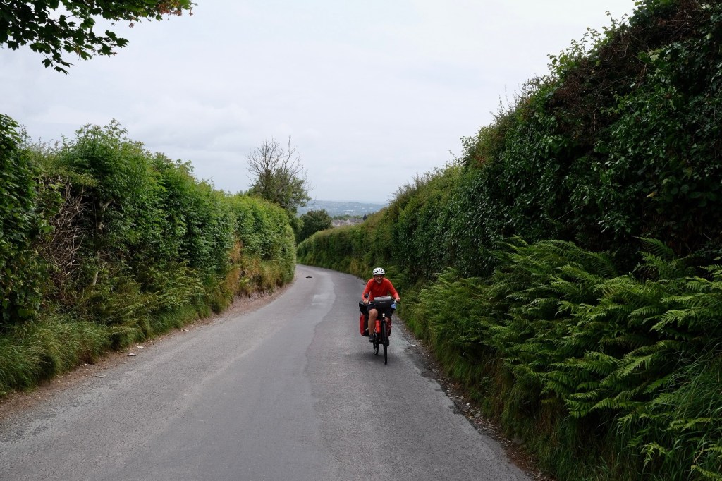 Dés le départ la première côte ne tarde pas. Elle est raide, l’échauffement est rude. La route étroite et sans bas-coté serpente entre deux talus hauts de deux à trois mètres et couverts de végétation. C’est un peu stressant car nous avons la sensation de bloquer les automobilistes qui, pour la plupart, attentifs et prudents patientent pour doubler.