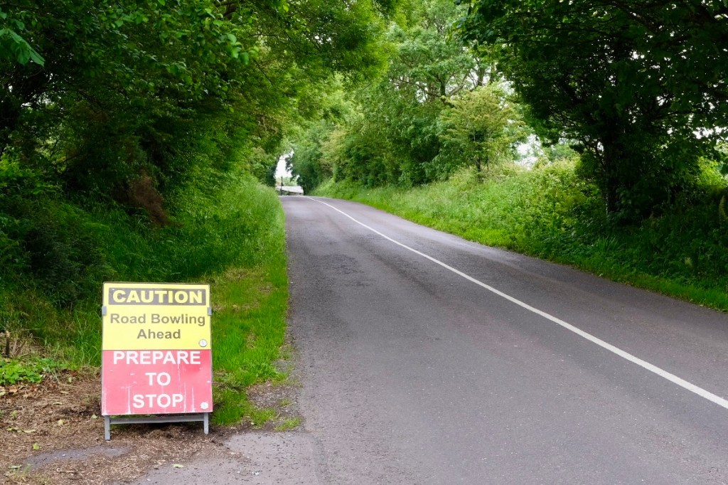 « Bowling en progress ». Cet énigmatique panneau se répète à deux reprises dans la deuxième longue montée. Il faudra arriver à son sommet pour en connaitre la signification. A la sortie d’un virage, plusieurs personnes font signe à une voiture de s’arrêter et me demande de me serrer sur le coté lorsque je vois dévaler à grande vitesse une petite boule de pétanque. Elle va finir sa course dans le remblai au milieu des hautes herbes, sous les applaudissement des participants.