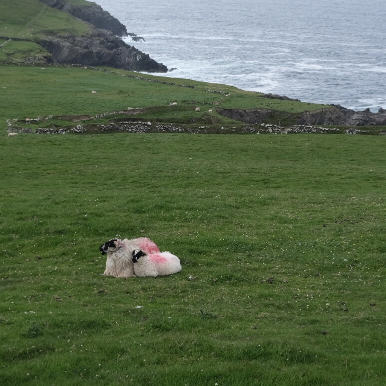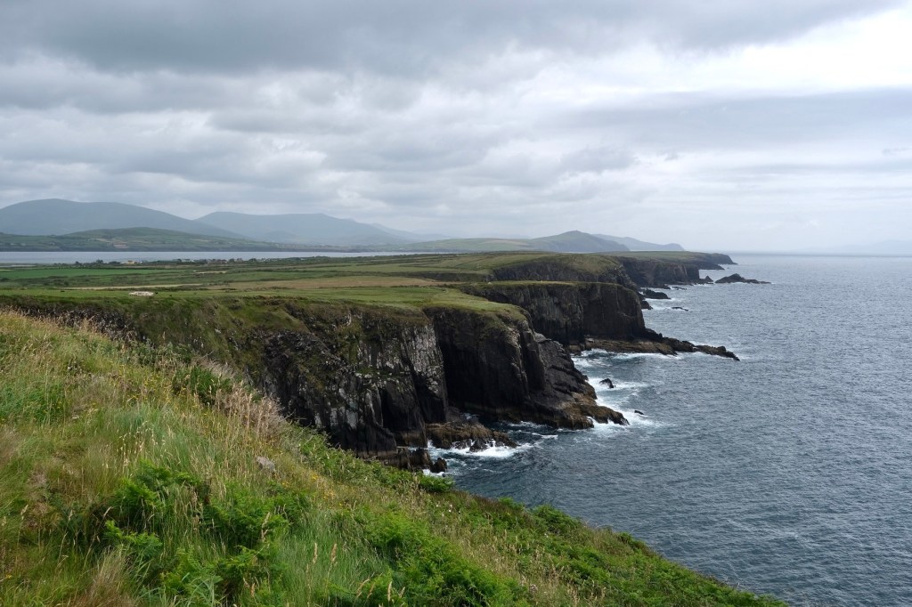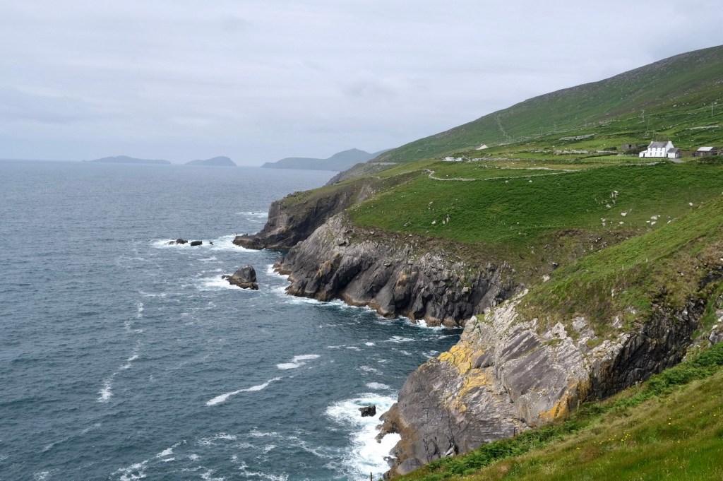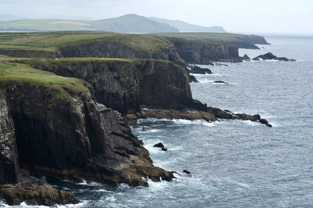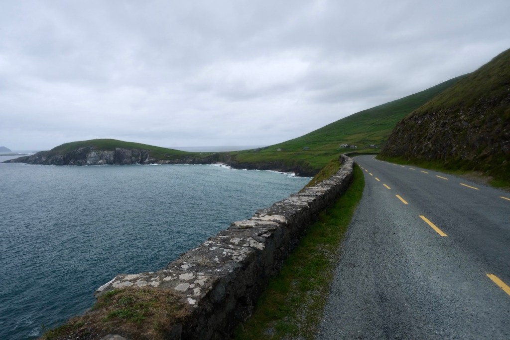 La route suit la baie de Dingle, les premières falaises apparaissent après le petit port de Ventry. Sur la droite les collines se découpent en mosaïques de murets. Ces paysages nous rappelle l’exposition de Skibbereen consacrée à la famine. Chaque famille de paysans possédait un petit lopin de terre sur lequel elle cultivait ses pommes de terre … avant que le mildiou n’arrive.