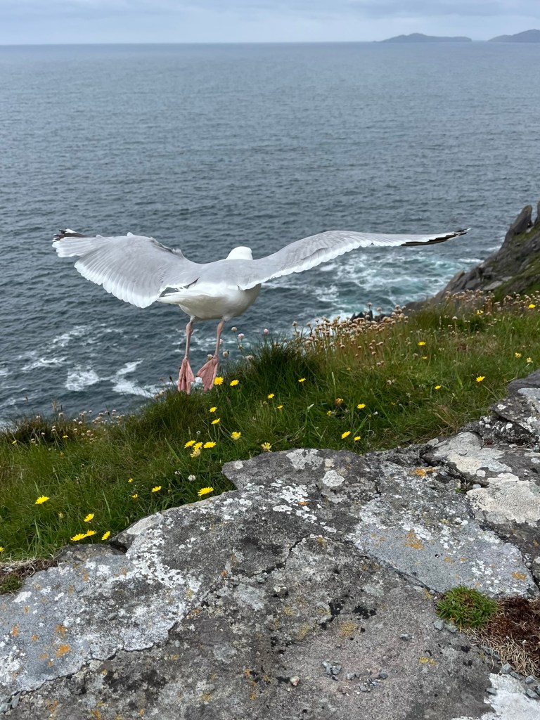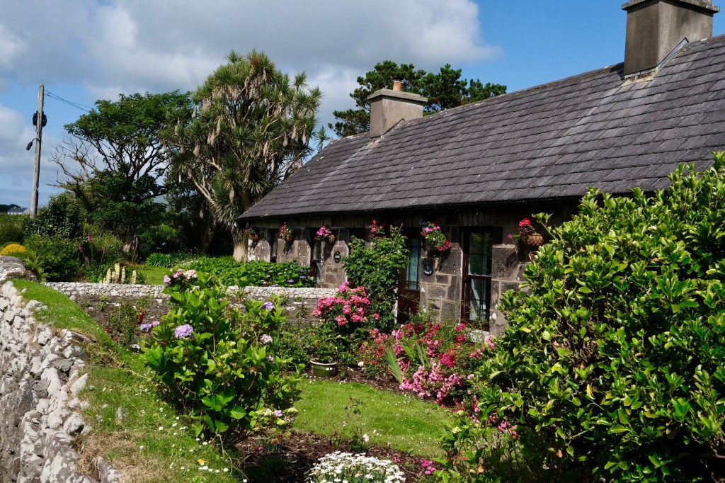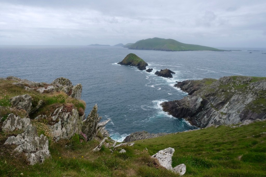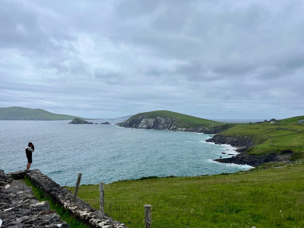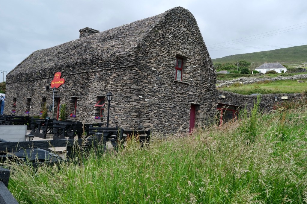 La route suit la baie de Dingle, les premières falaises apparaissent après le petit port de Ventry. Sur la droite les collines se découpent en mosaïques de murets. Ces paysages nous rappelle l’exposition de Skibbereen consacrée à la famine. Chaque famille de paysans possédait un petit lopin de terre sur lequel elle cultivait ses pommes de terre … avant que le mildiou n’arrive.