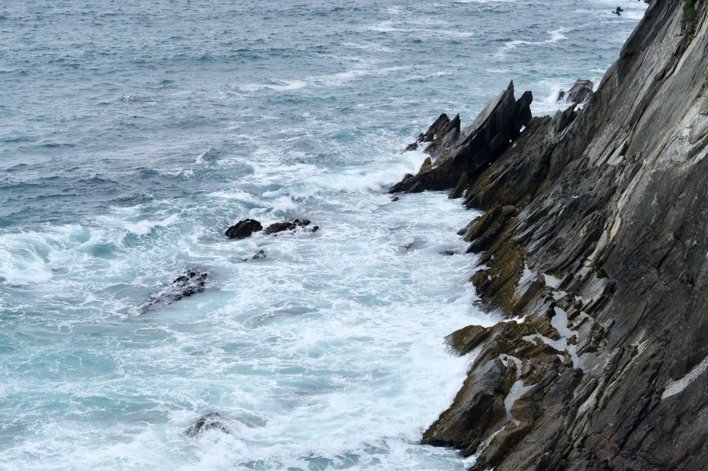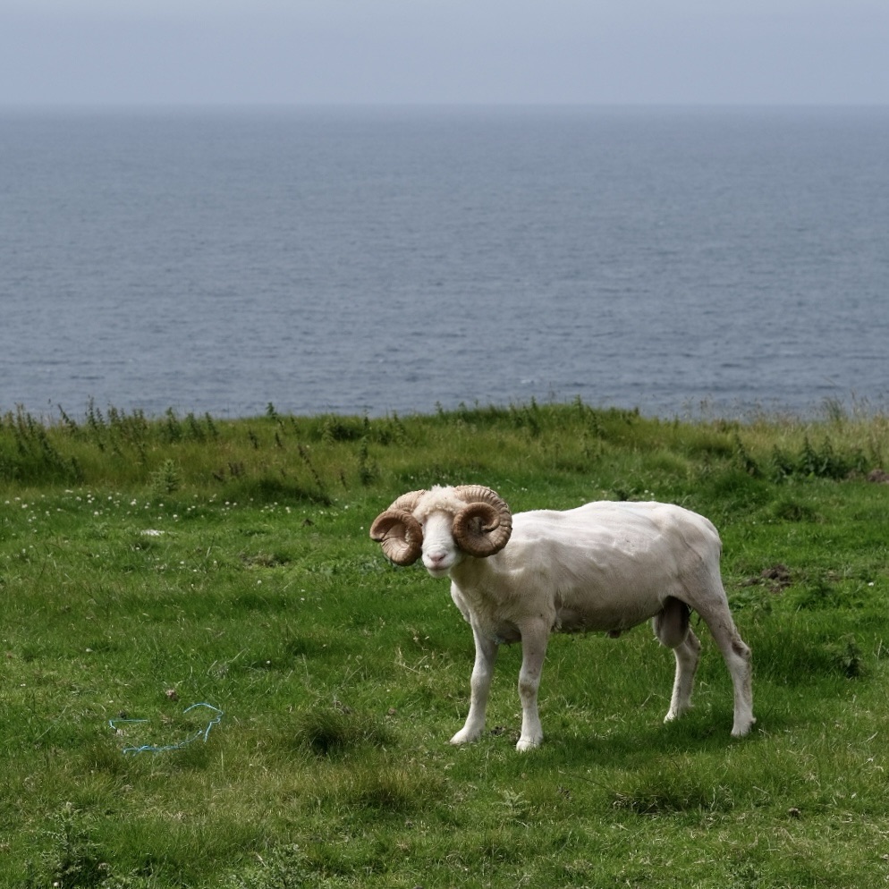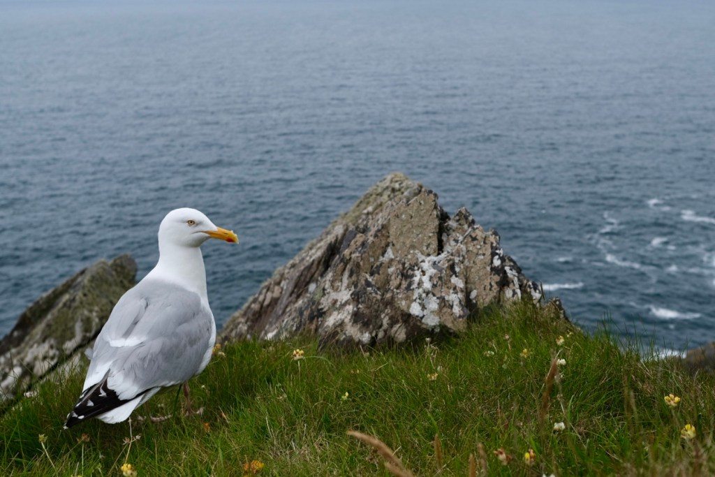 Les falaises impressionnent. Vers l’extrémité occidentale la cote découpée, les îles qui commencent à se perdre dans la brume, ont offert leurs décors au film « Les derniers Jedi » Star Wars VIII. C’est d’ailleurs dans ce décor que nous sortons nos sandwichs. Face à nous le géant couché se repose. Au pied des falaises un phoque joue à cache-cache. Il nage un peu, plonge, ressort plus loin. Quelques touristes l’ont aperçu, téléphone à la main essaient de capter l’instant où il fera tourner un ballon sur son nez … Mais ça marche pas et bientôt il filera rejoindre ses copains … Des mouettes, sternes ou fous de bassan jouent avec le vent le long des falaises. Magique.