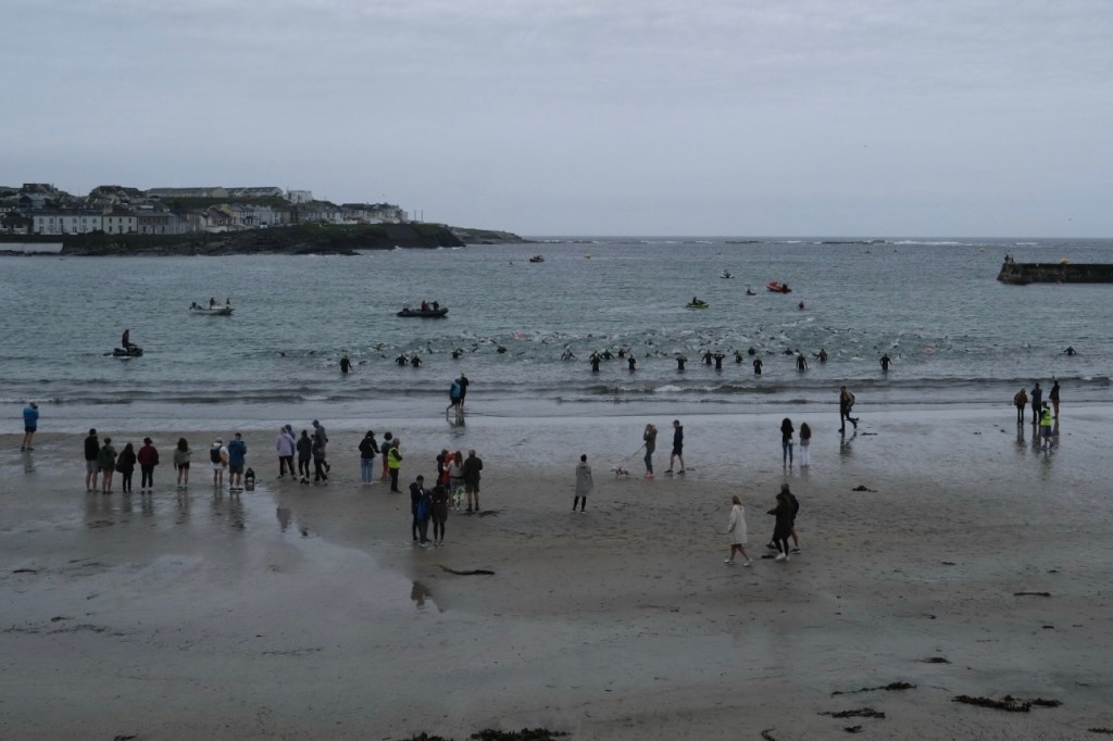 Sur la plage s’agitent quelques centaines de triathlètes. Vu la température il vaut mieux effectivement qu’ils bougent leurs bras avant de plonger dans l’océan à 14 degrés pour 1500 mètres de natation.