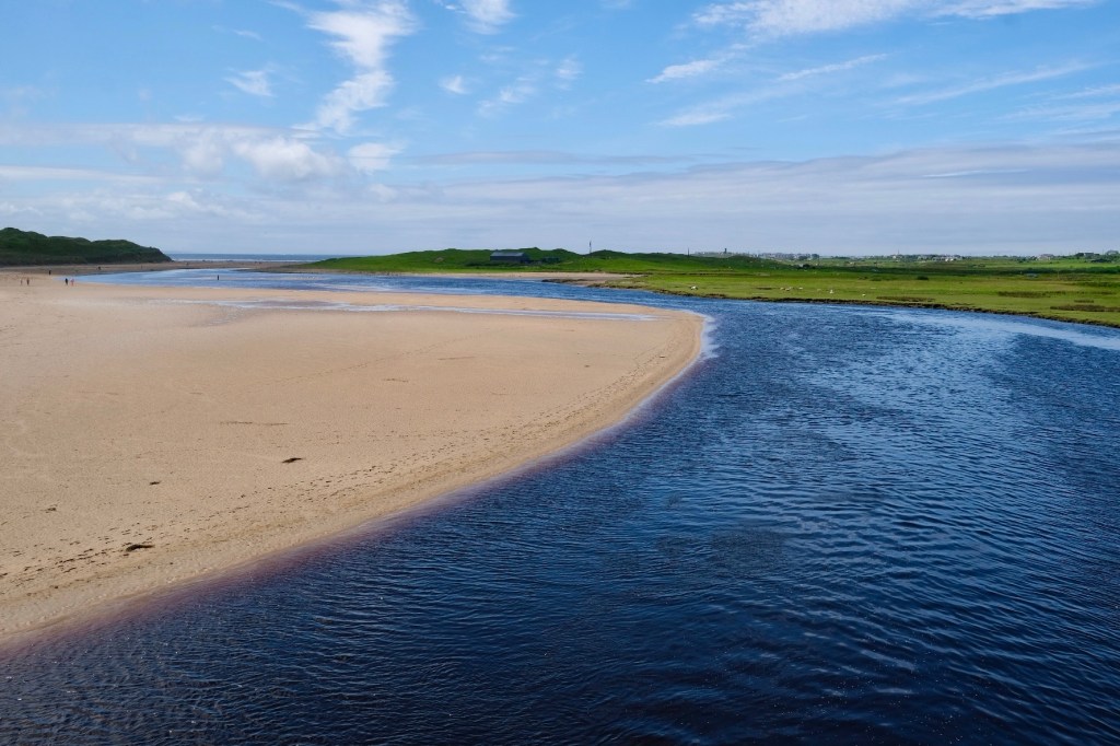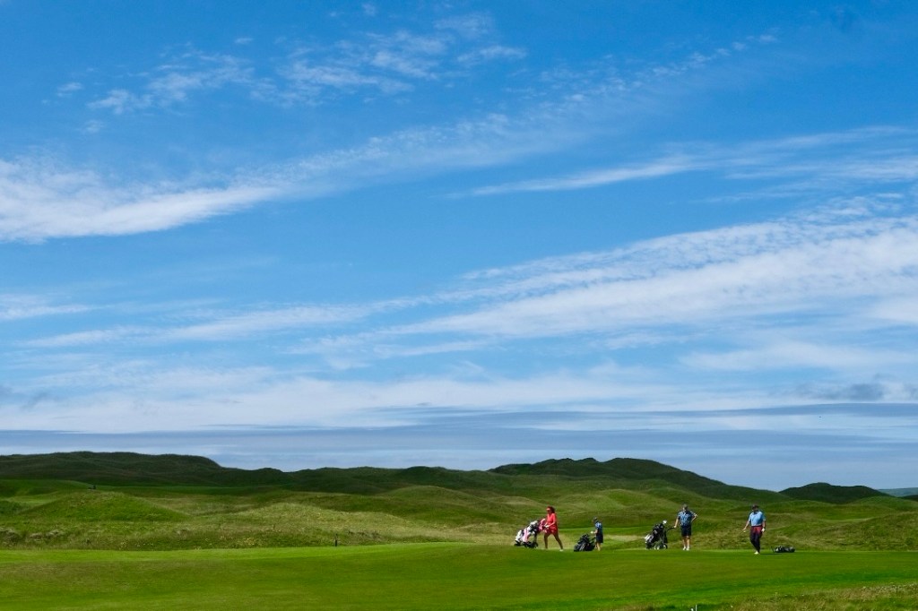 Toujours quelques points de vue qui parfois s’illuminent, une baie de surfeurs en ce dimanche matin, un golf fréquenté, la petite route serpente bordée de murs, progressivement le paysage s’élargie.