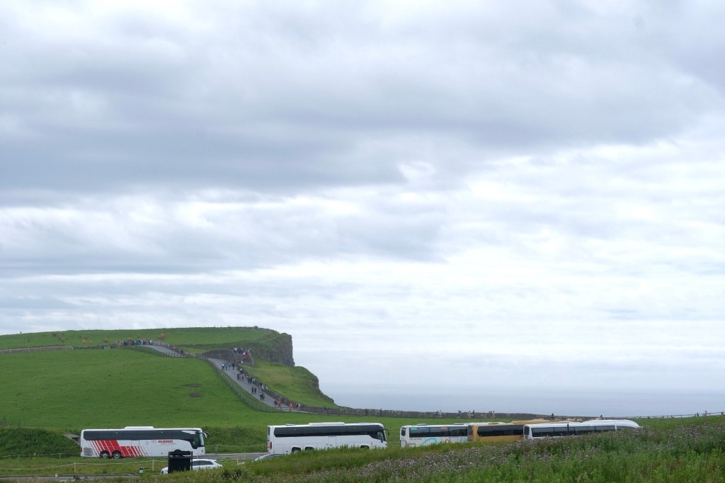 Il reste un dernier kilomètre pour atteindre le point culminant des falaises. La circulation est plutôt dense. Voitures, bus, camping car, grand parking. Le lieu – on pouvait s’en douter – est extrêmement touristique et en plus c’est dimanche.