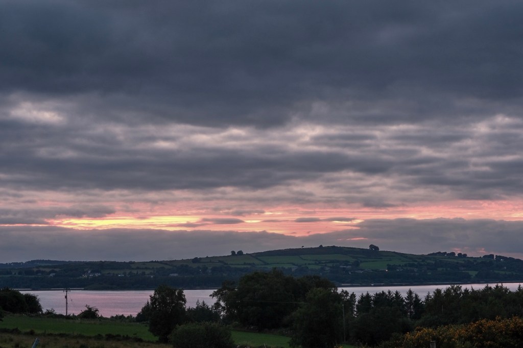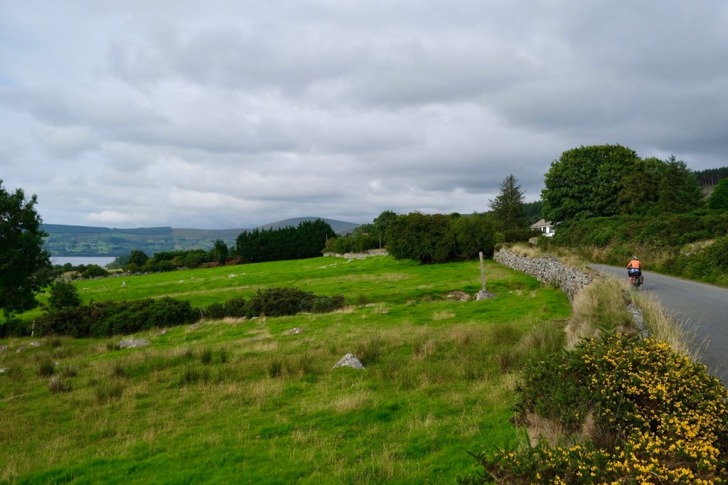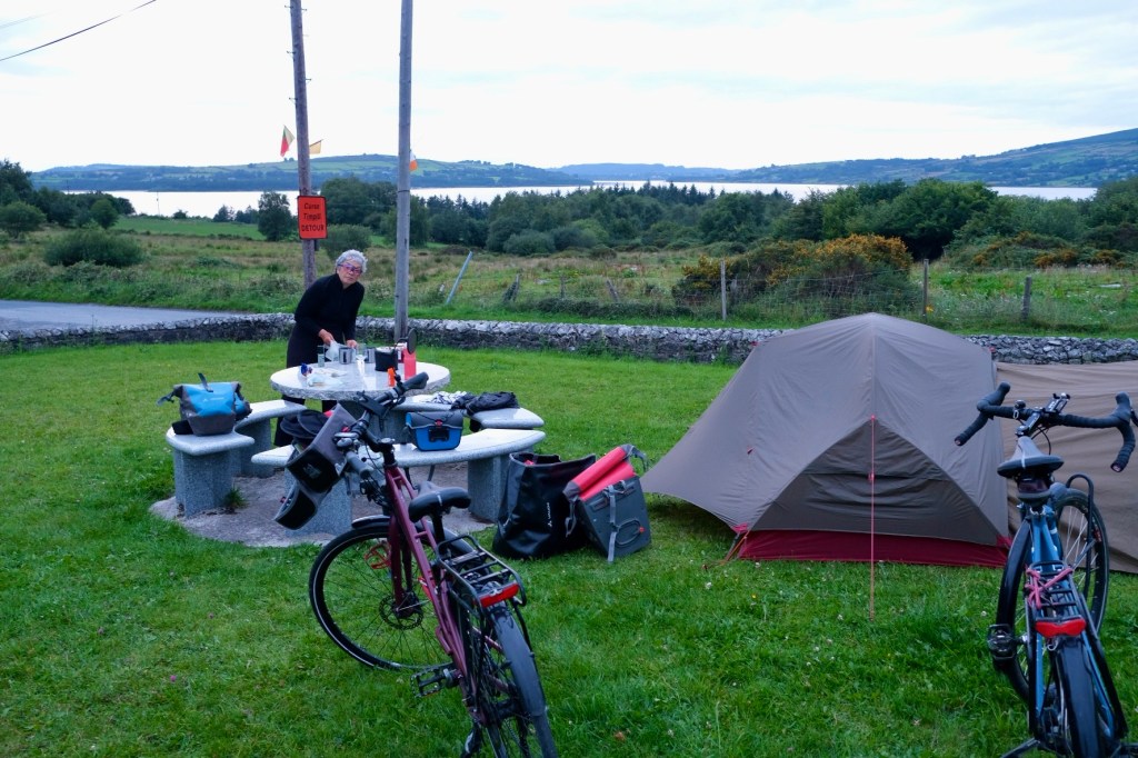Il reste une dizaine de kilomètres, il est tard et nous commençons à fatiguer. Un hébergement serait possible lorsque surgit à la sortie du village de Ballyknockan, un espace pique-nique, tables en marbre et pelouse tondue. Magnifique, il ne reste plus qu’à planter la tente à coté de deux camping-cars.