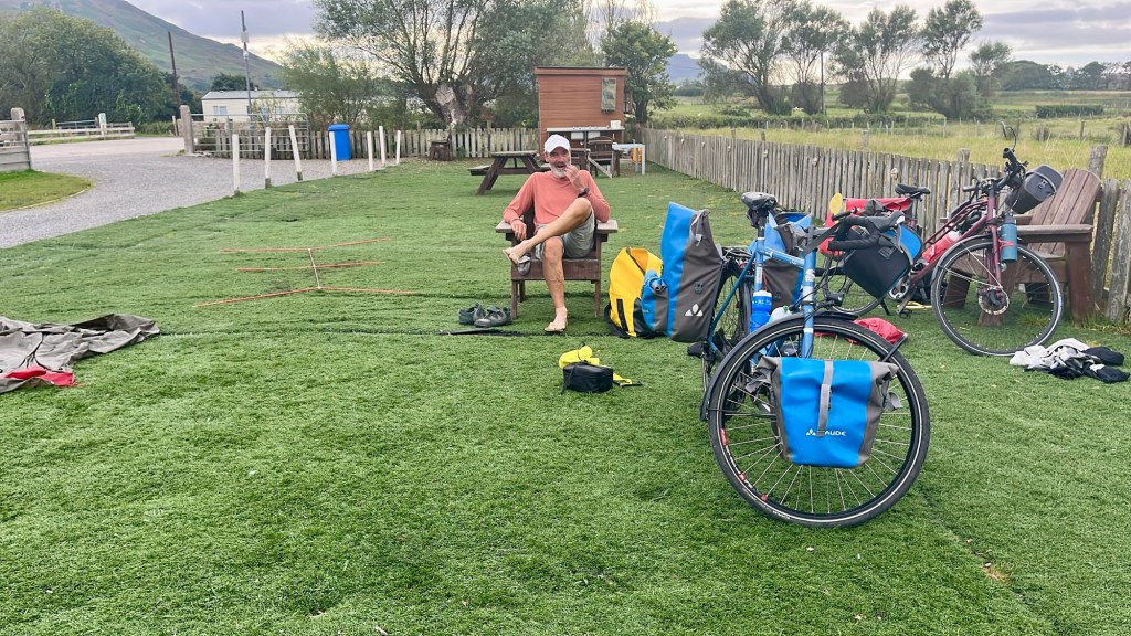 Aussi incroyable que cela puisse paraitre, une partie du camping est couverte de pelouse … synthétique !! Poser de la moquette verte avec toute l’eau qui tombe sur le pays semble inimaginable. Et pourtant la tente sera posée sur ce support !!