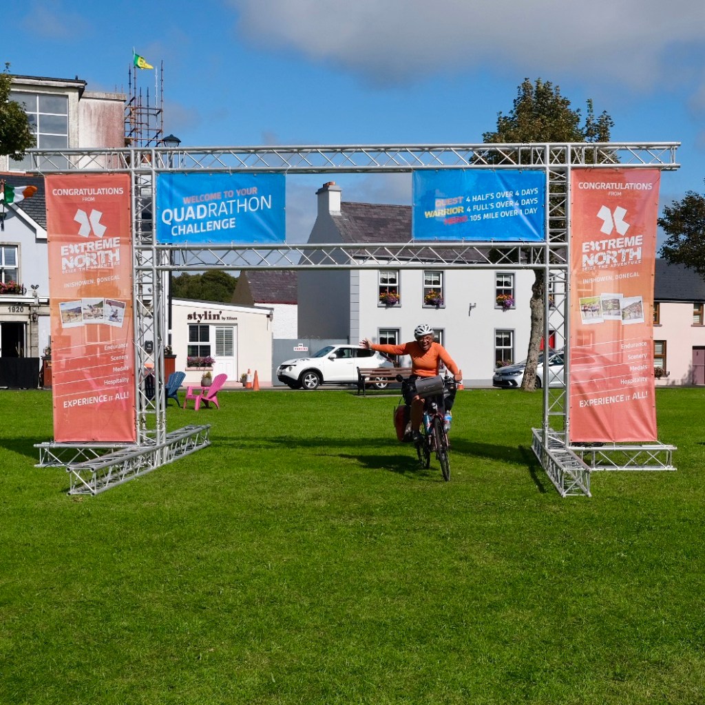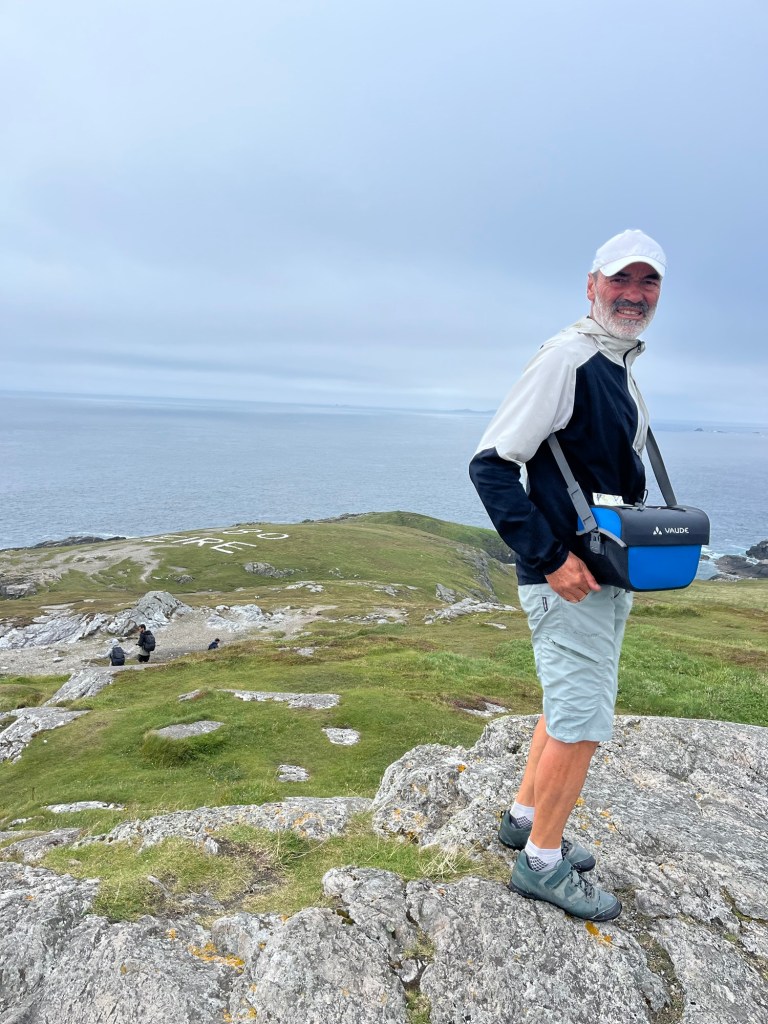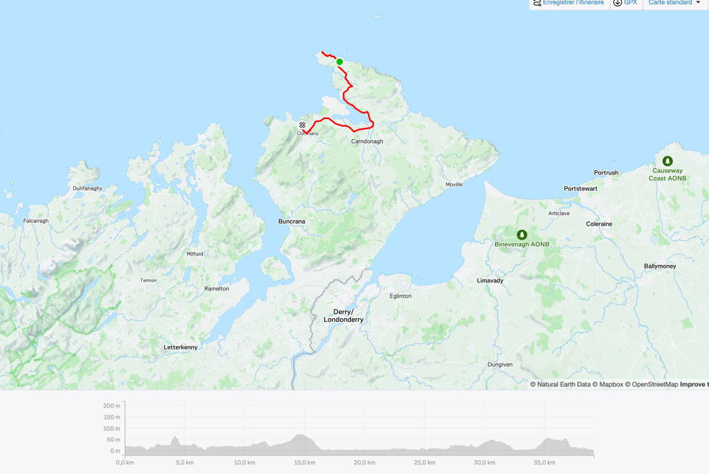 Des panneaux indiquent des distances en miles. Cela ressemble à des indications de course. Effectivement une course de quatre jours va se courir. Sur la pointe de Malin une épreuve de quatre marathons (26 miles 42km) en quatre jours est programmée. Les plus costauds pourront courir les quatre marathons le même jour. Je ne suis pas assez entrainé !!